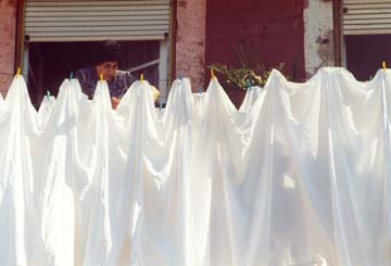 Portugese vrouw hangt de was op.