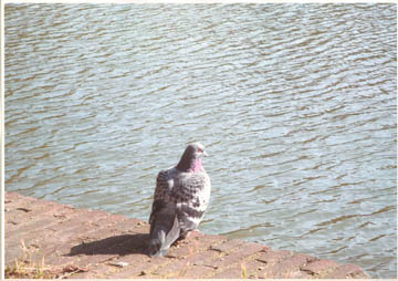 dikke stadsduif, symbool staand voor de stad, zit op een muurtje